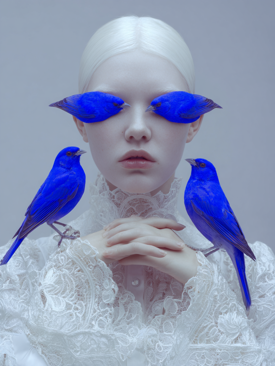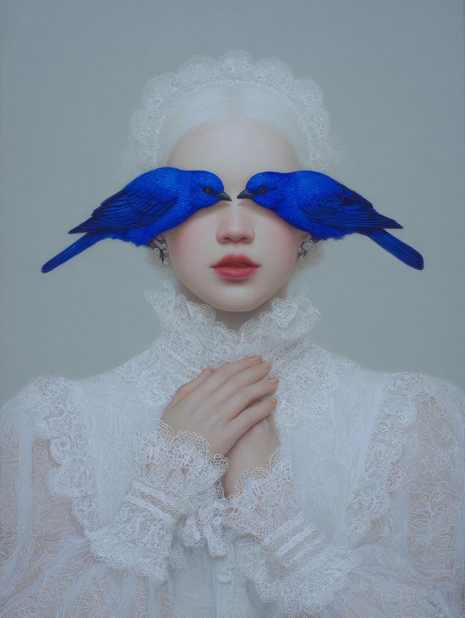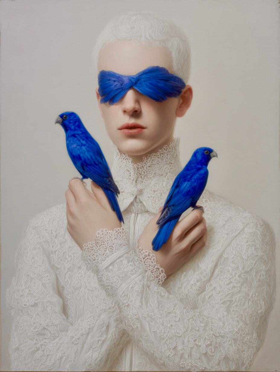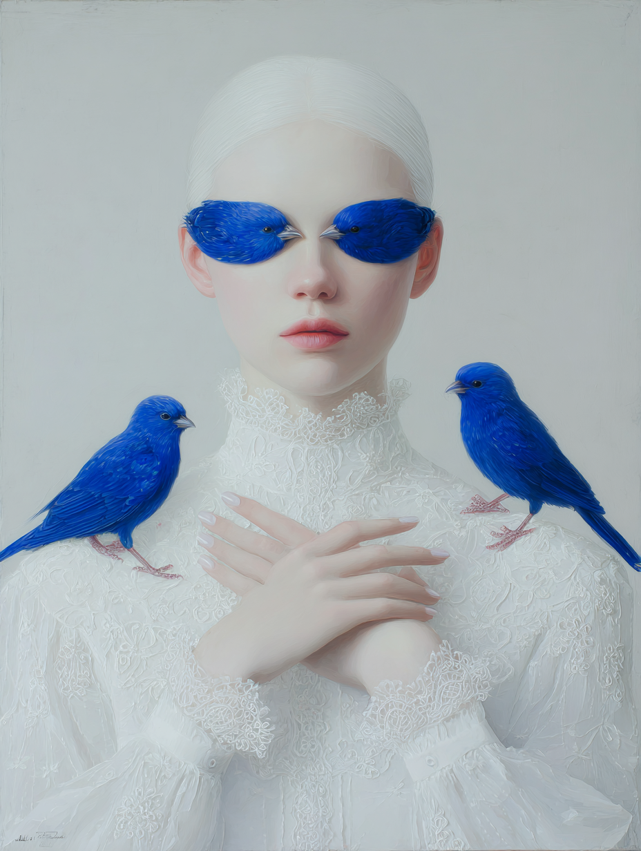 However, her gaze is denied by two birds of intense cobalt blue, a chromatic element of disruption that acts as a veil. The bird, a classic symbol of vision and spiritual freedom, is here transformed into an obstacle, suggesting that truth or identity in the digital era are perpetually filtered, mediated, or obscured.