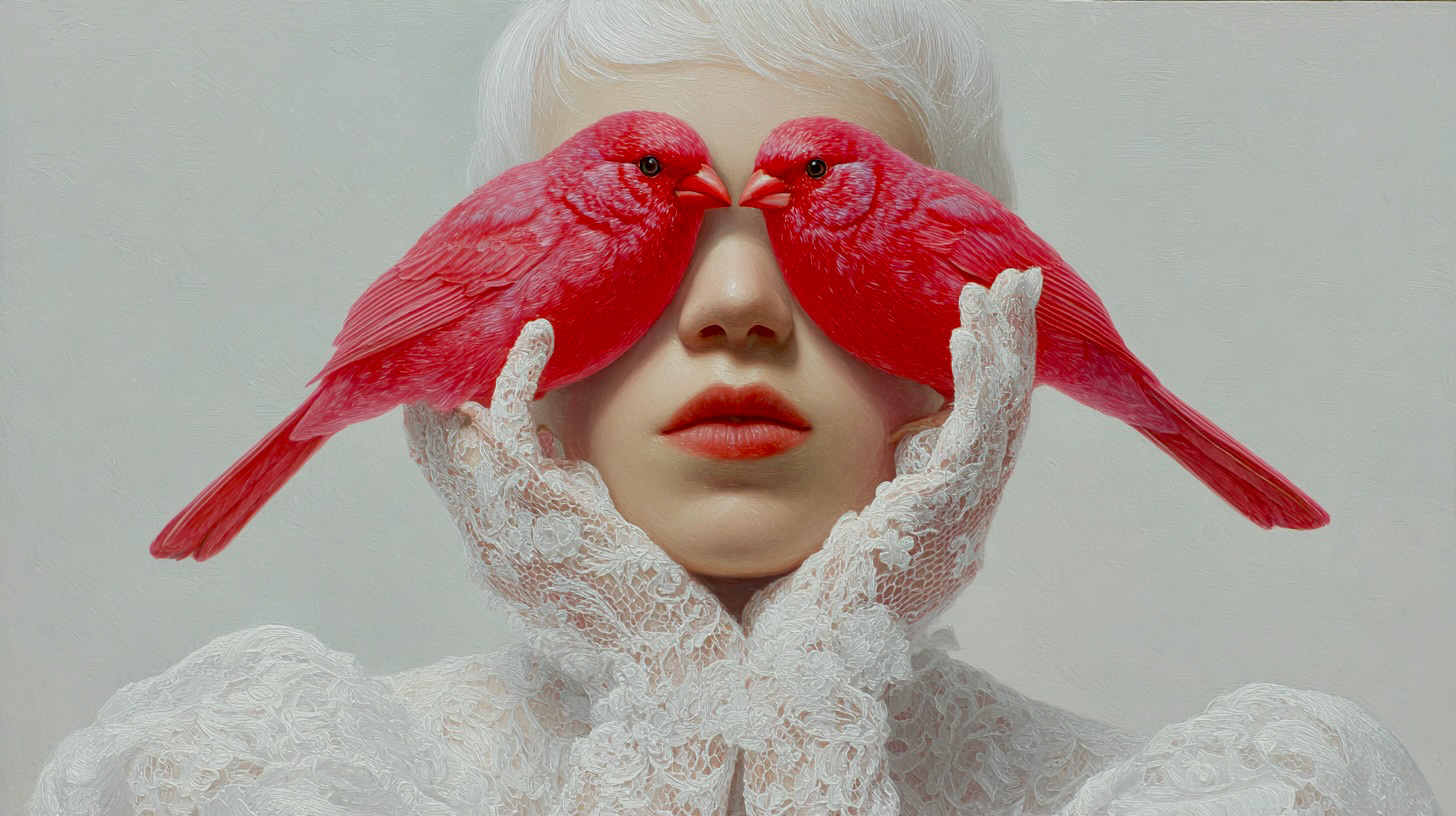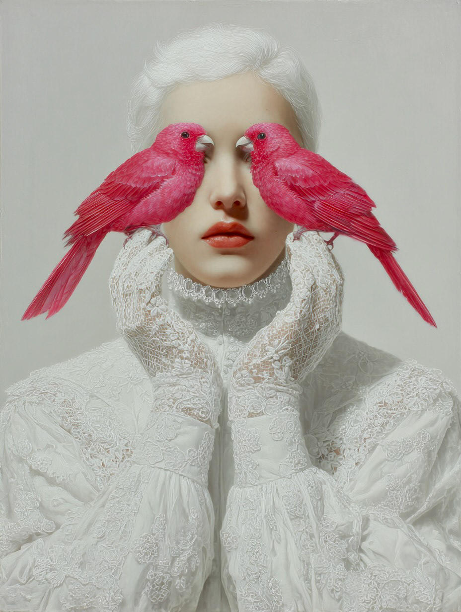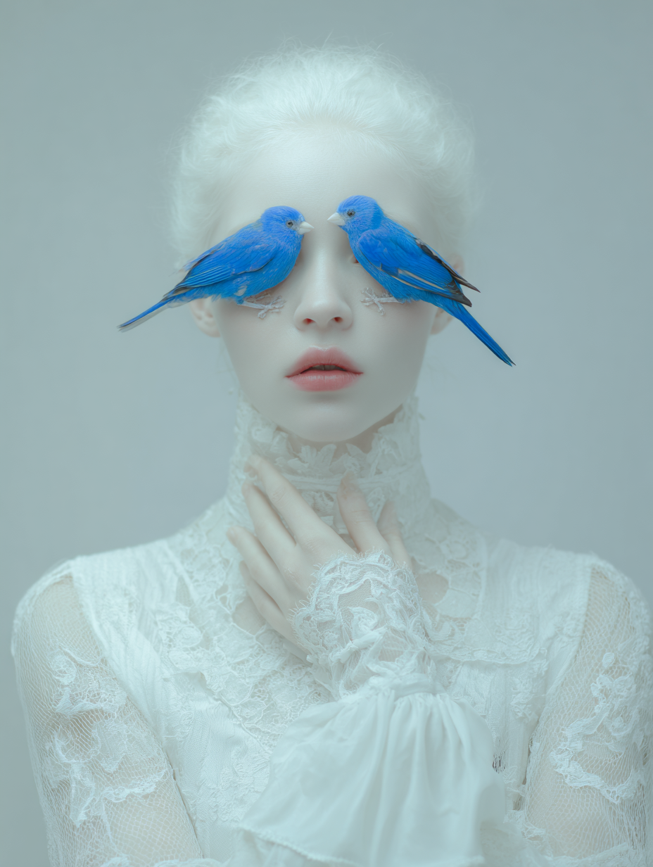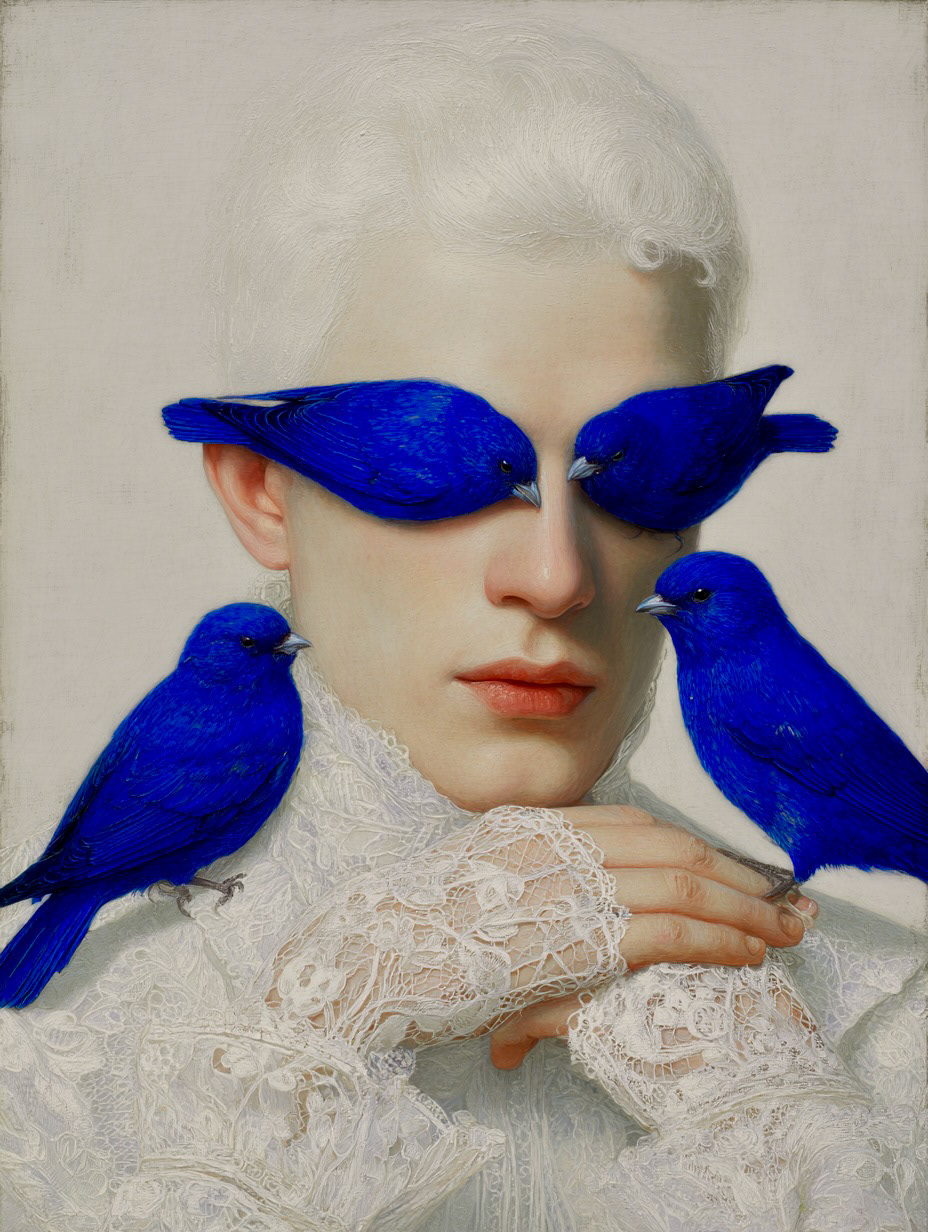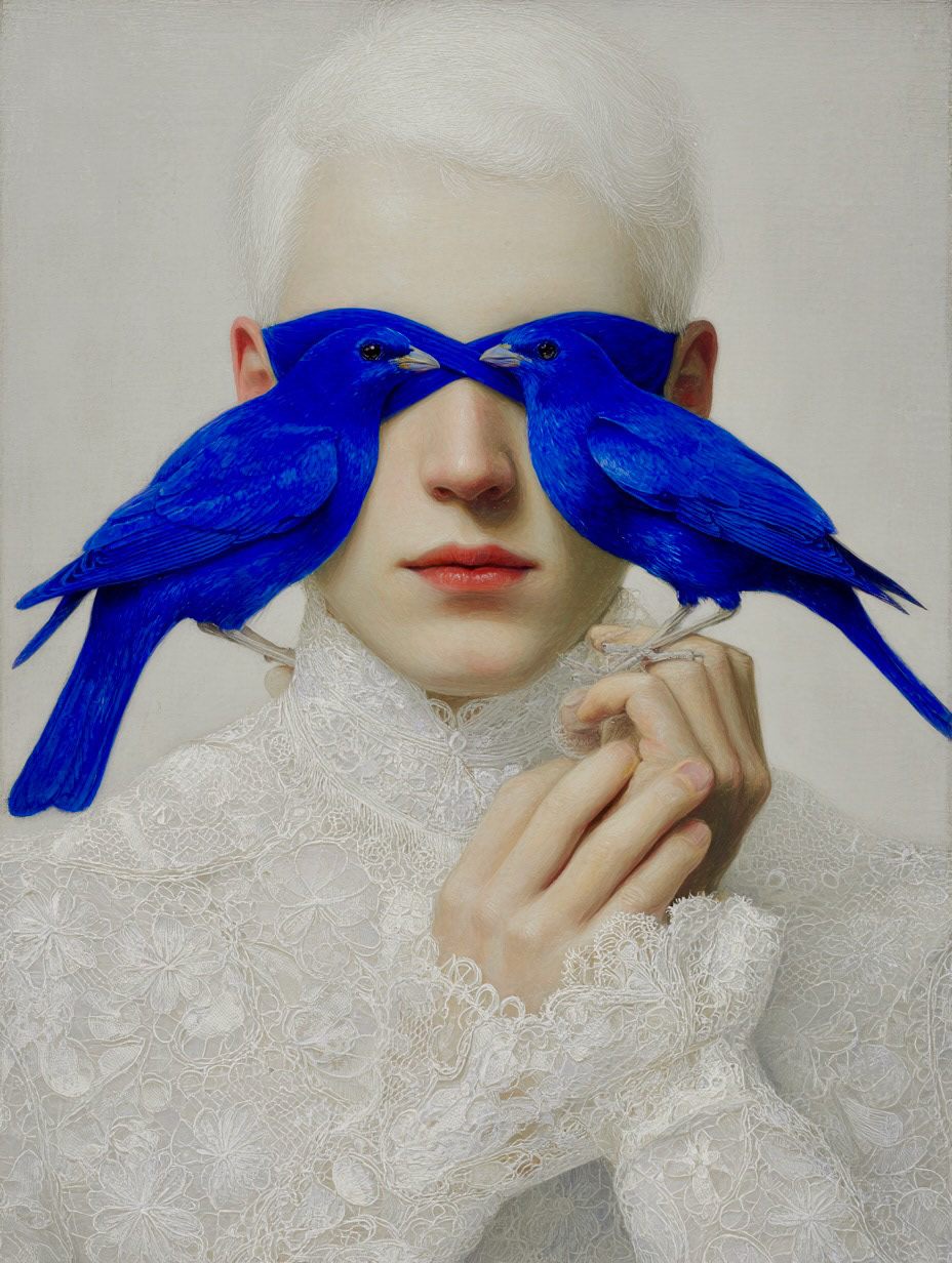 However, her gaze is denied by two birds of intense cobalt blue, a chromatic element of disruption that acts as a veil. The bird, a classic symbol of vision and spiritual freedom, is here transformed into an obstacle, suggesting that truth or identity in the digital era are perpetually filtered, mediated, or obscured.