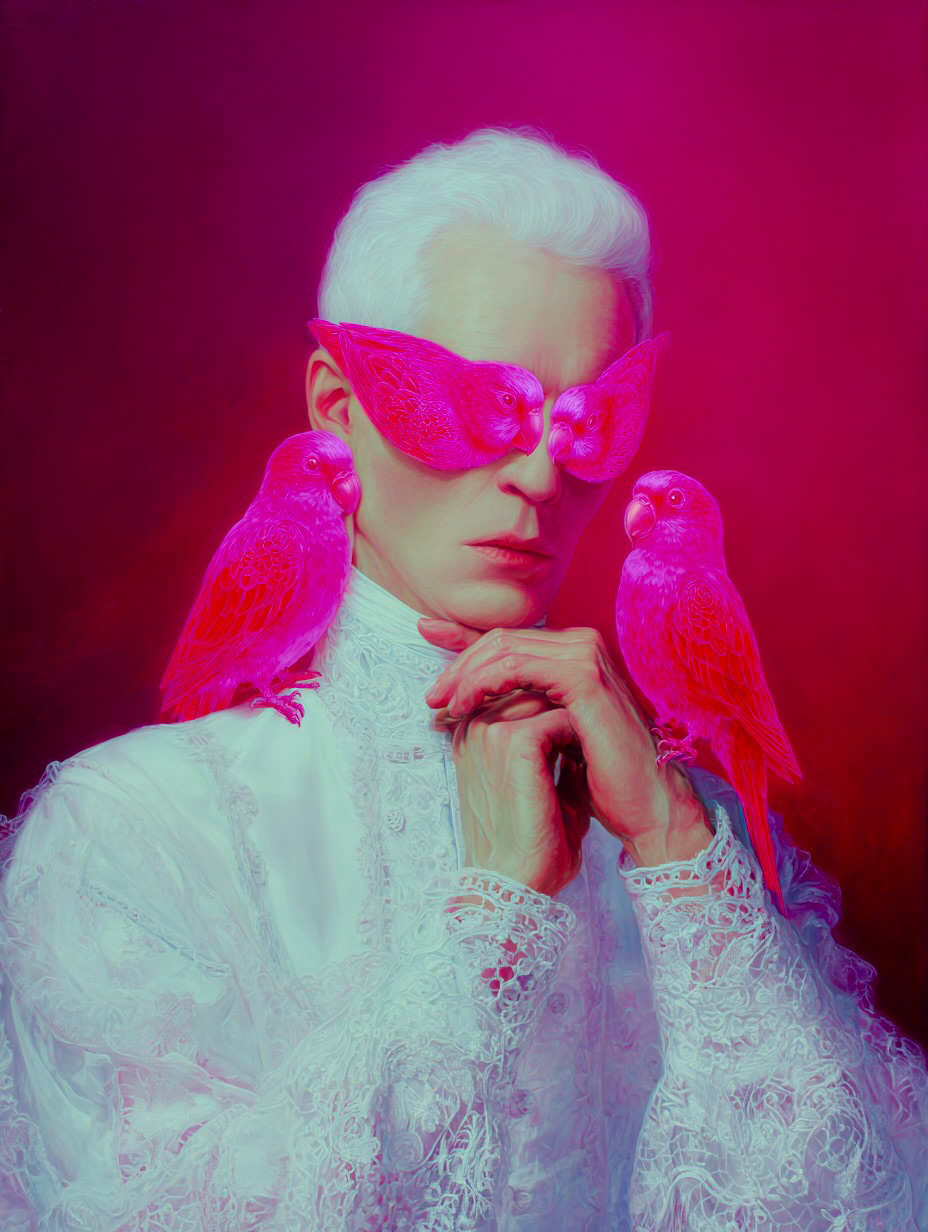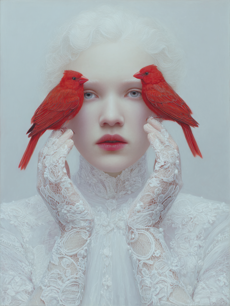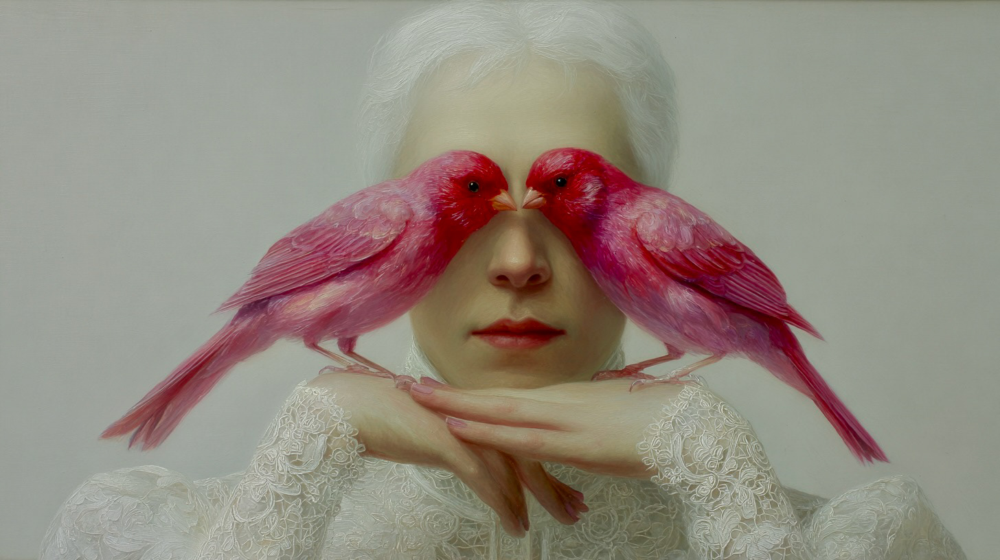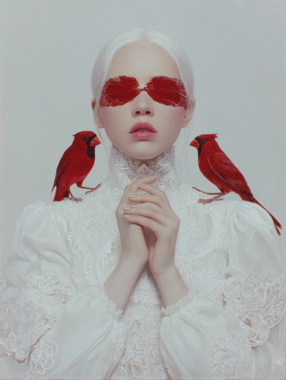 However, her gaze is denied by two birds of intense cobalt blue, a chromatic element of disruption that acts as a veil. The bird, a classic symbol of vision and spiritual freedom, is here transformed into an obstacle, suggesting that truth or identity in the digital era are perpetually filtered, mediated, or obscured.