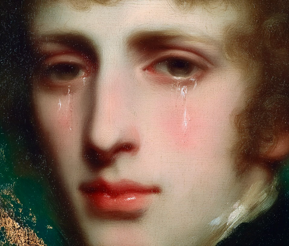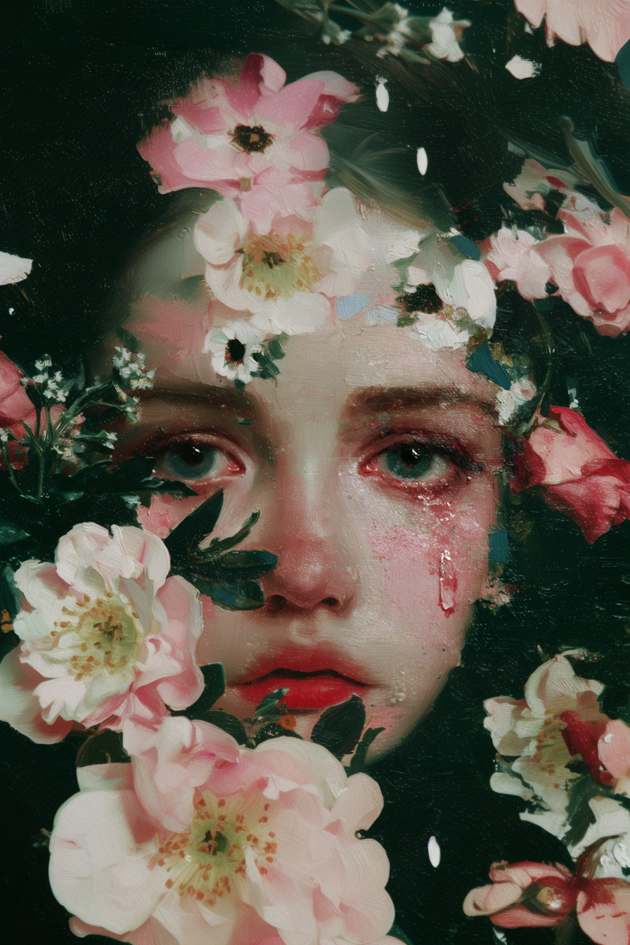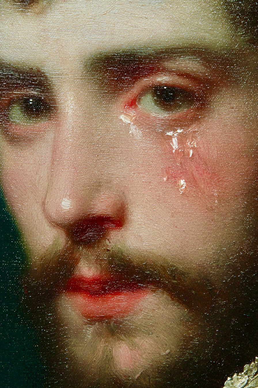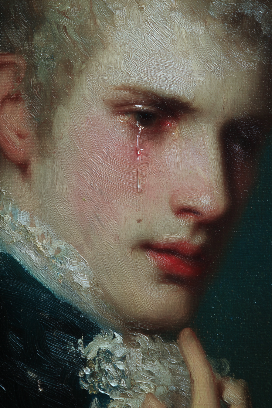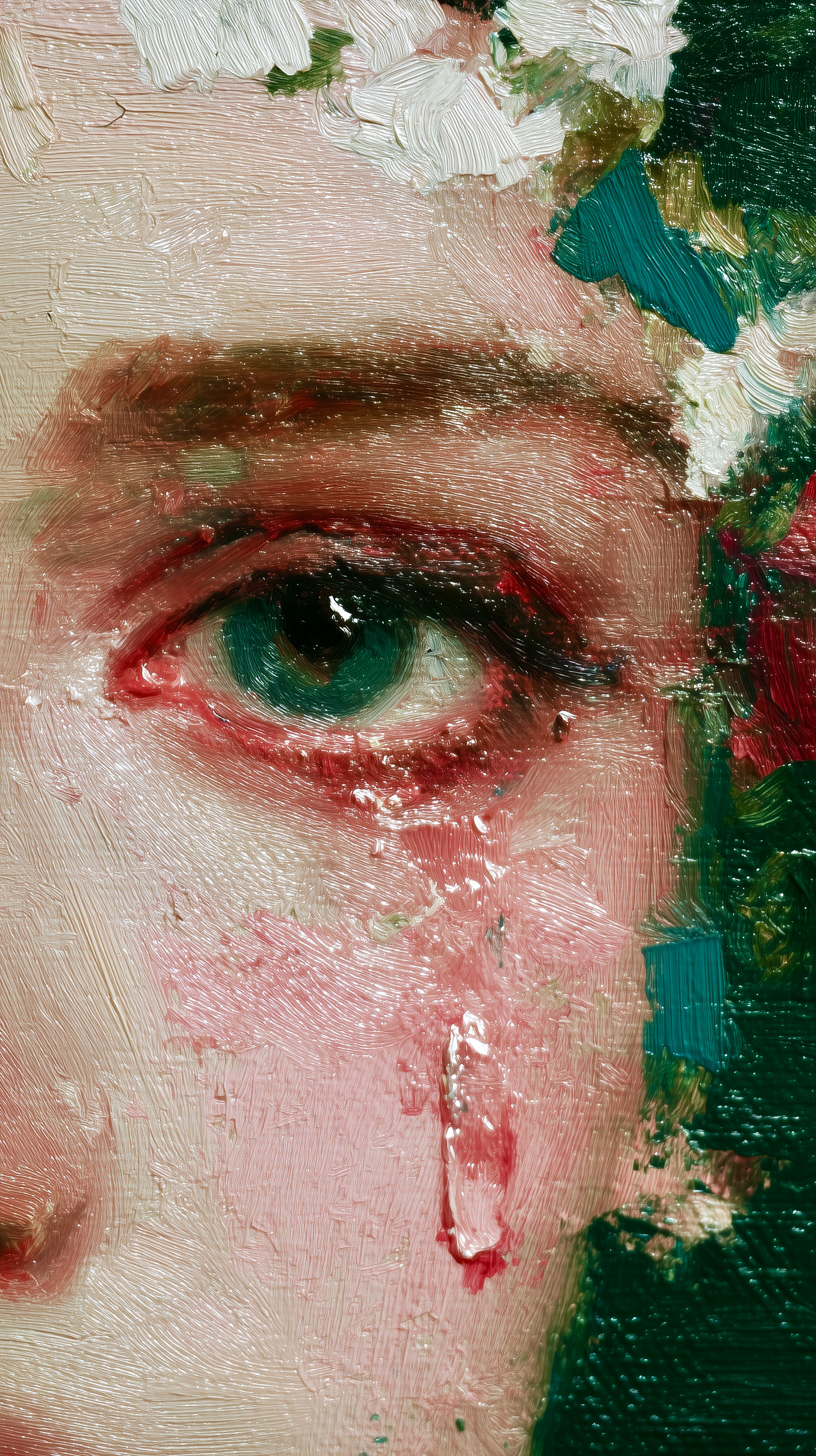 Analyzing this extraordinary detail in Baroque oil style, we reflect on the union between technical precision and emotional depth. The tear is not just water; it is a narrative on the canvas.